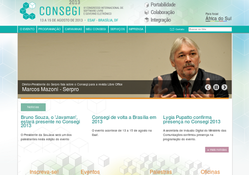O sítio da sexta edição do Consegi (Congresso Internacional Software Livre e Governo Eletrônico) já está disponível no www.consegi.gov.br. No endereço, é possível realizar a inscrição, que é gratuita; conhecer alguns dos palestrantes confirmados; e saber um pouco mais sobre os eventos paralelos ao congresso. A grade provisória de palestras e oficinas também já foi divulgada ao público.