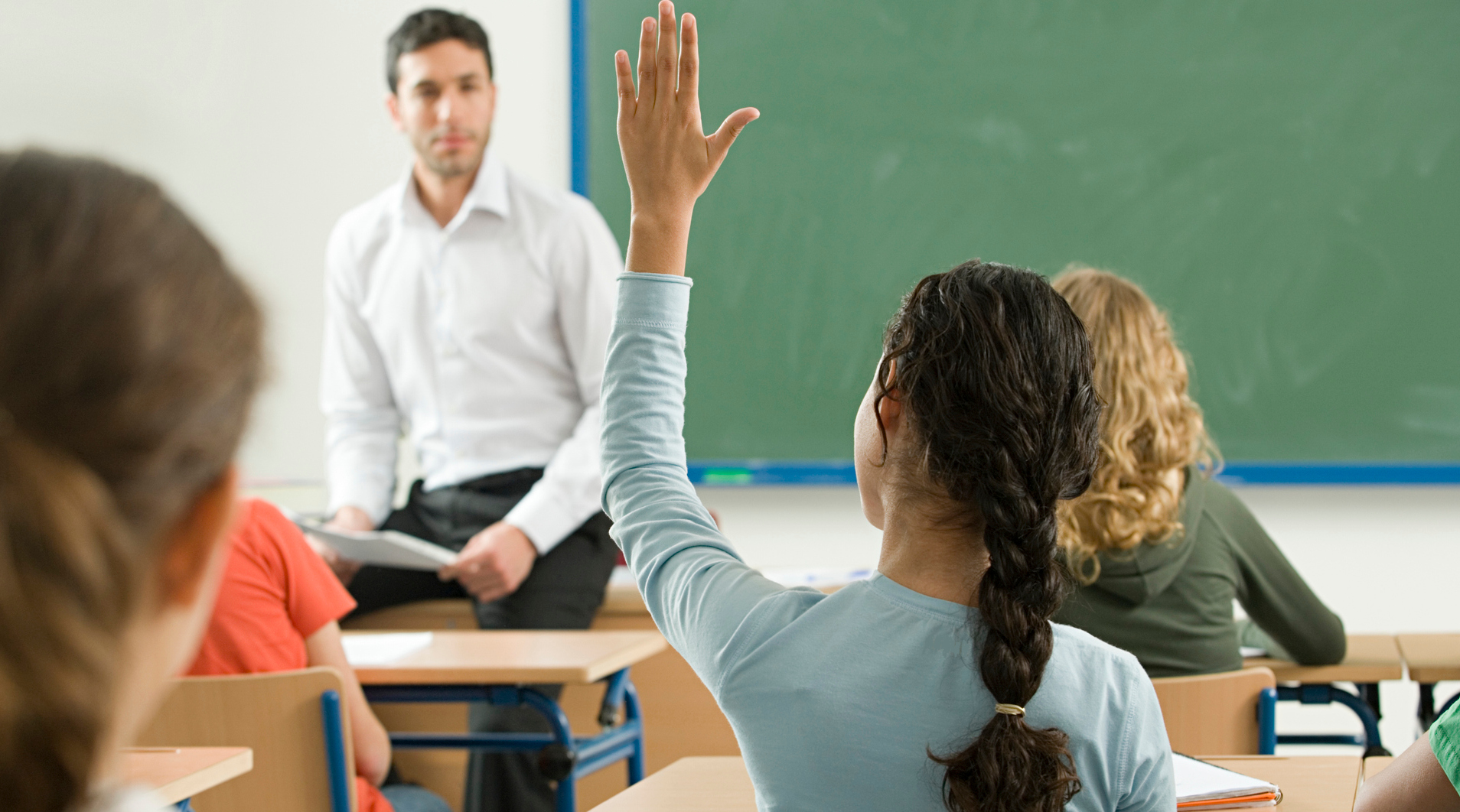 Foto com professor e alunos, em sala de aula. Uma aluna está com mão levantada, para fazer uma pergunta
