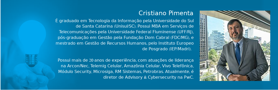 É graduado em Tecnologia da Informação pela Universidade do Sul de Santa Catarina (Unisul/SC). Possui MBA em Serviços de Telecomunicações pela Universidade Federal Fluminense (UFF/RJ), pós-graduação em Gestão pela Fundação Dom Cabral (FDC/MG), e mestrado em Gestão de Recursos Humanos, pelo Instituto Europeo de Posgrado (IEP/Madri). Possui mais de 20 anos de experiência, com atuações de liderança na Arcon/Nec, Telemig Celular, Amazônia Celular, Vivo Telefônica, Módulo Security, Microsiga, RM Sistemas, Petrobras. Atualmente, é diretor de Advisory & Cybersecurity na PwC.