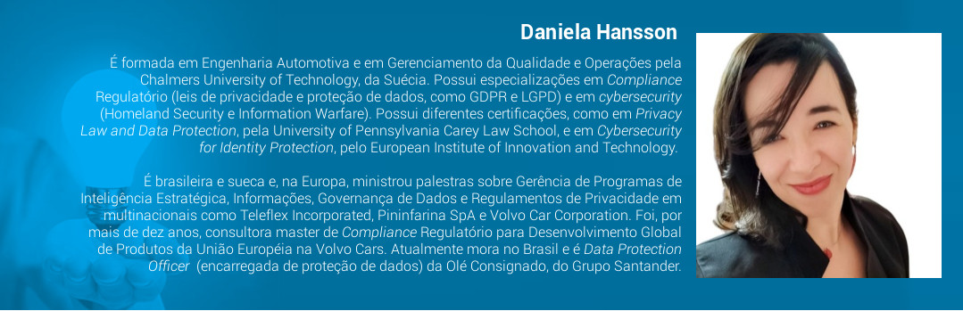 É formada em Engenharia Automotiva e em Gerenciamento da Qualidade e Operações pela Chalmers University of Technology, da Suécia. Possui especializações em Compliance Regulatório (leis de privacidade e proteção de dados, como GDPR e LGPD) e em cybersecurity (Homeland Security e Information Warfare). Possui diferentes certificações, como em Privacy Law and Data Protection, pela University of Pennsylvania Carey Law School, e em Cybersecurity for Identity Protection, pelo European Institute of Innovation and Technology. É brasileira e sueca e, na Europa, ministrou palestras sobre Gerência de Programas de Inteligência Estratégica, Informações, Governança de Dados e Regulamentos de Privacidade em multinacionais como Teleflex Incorporated, Pininfarina SpA e Volvo Car Corporation. Foi, por mais de dez anos, consultora master de Compliance Regulatório para Desenvolvimento Global de Produtos da União Européia na Volvo Cars. Atualmente mora no Brasil e é Data Protection Officer (encarregada de proteção de dados) da Olé Consignado, do Grupo Santander.