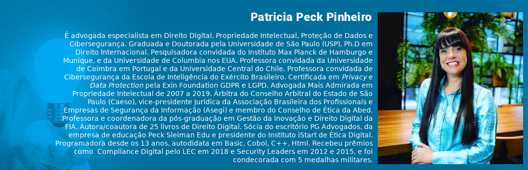 É advogada especialista em Direito Digital, Propriedade Intelectual, Proteção de Dados e Cibersegurança. Graduada e Doutorada pela Universidade de São Paulo (USP), PhD em Direito Internacional. Pesquisadora convidada do Instituto Max Planck de Hamburgo e Munique, e da Universidade de Columbia nos EUA. Professora convidada da Universidade de Coimbra em Portugal e da Universidade Central do Chile. Professora convidada de Cibersegurança da Escola de Inteligência do Exército Brasileiro. Certificada em Privacy e Data Protection pela Exin Foundation em GDPR e LGPD. Advogada Mais Admirada em Propriedade Intelectual de 2007 a 2019. Árbitra do Conselho Arbitral do Estado de São Paulo (Caeso), vice-presidente Jurídica da Associação Brasileira dos Profissionais e Empresas de Segurança da Informação (Aseg) e membro do Conselho de Ética da Abed. Professora e coordenadora da pós-graduação em Gestão da Inovação e Direito Digital da FIA. Autora/coautora de 25 livros de Direito Digital. Sócia do escritório PG Advogados, da empresa de educação Peck Sleiman Edu e presidente do Instituto iStart de Ética Digital. Programadora desde os 13 anos, autodidata em Basic, Cobol, C++, Html. Recebeu prêmios como Compliance Digital pelo LEC em 2018 e Security Leaders em 2012 e 2015, e foi concedorada com 5 medalhas militares.
