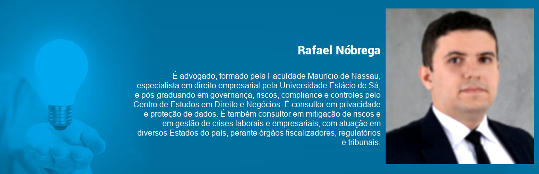 Foto e minicurrículo de Rafael Nóbrega: é advogado, especialista em direito empresarial e pós-graduando em governança, riscos ecompliance. É consultor em privacidade e proteção de dados, em mitigação de riscos e gestão de crises laborais e empresariais.