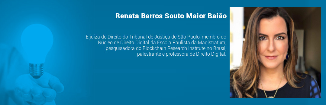 Box com foto e minicurrículo de Renata Baião, que é juíza de Direito do Tribunal de Justiça de São Paulo, membro do Núcleo de Direito Digital da Escola Paulista da Magistratura, pesquisadora do Blockchain Research Institute no Brasil, palestrante e professora de Direito Digital.