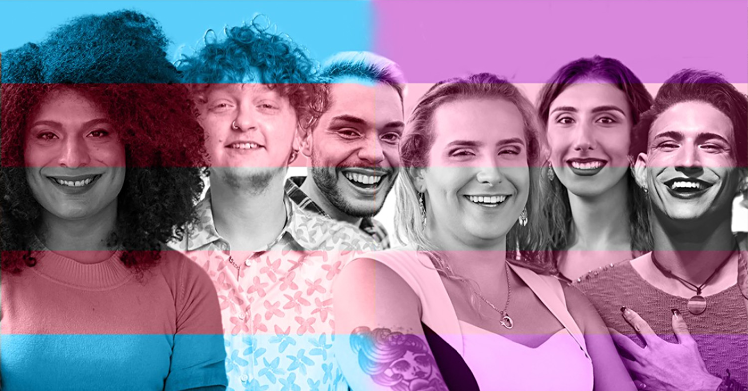 Fotos de pessoas trans e travestis em foto com os tons rosa e azul da bandeira trans