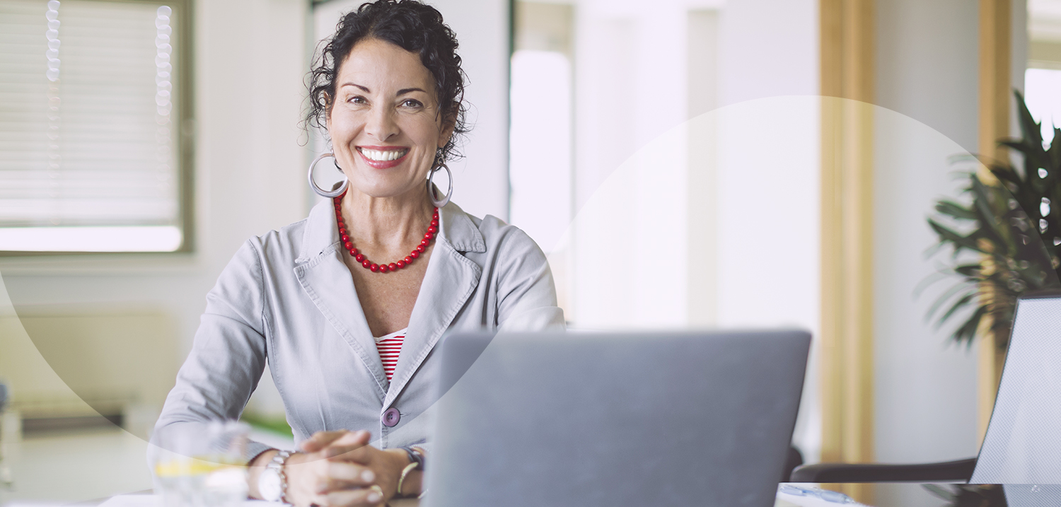 Mulher sorrindo com as mãos apoiadas em uma mesa onde está posicionado um laptop