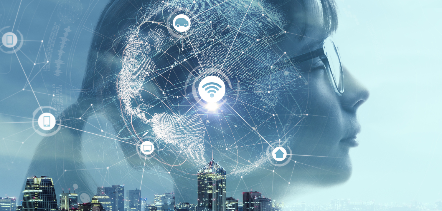 Foto em tom azul claro de rosto de criança de perfil com aplicação de ícones de tecnologia e cidade conectados. No canto inferior direito, imagem de prédios de uma cidade moderna.
