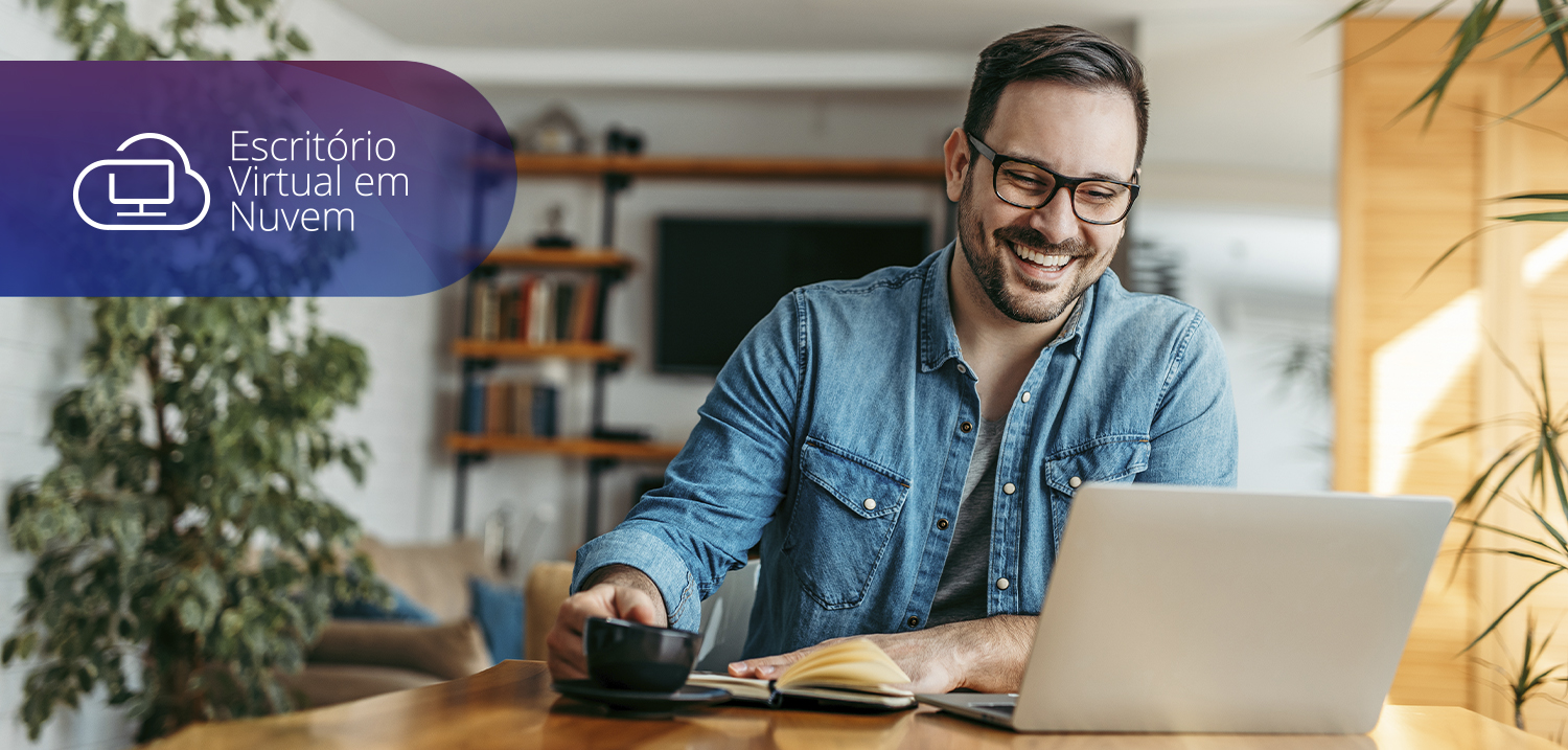 Homem trabalhando em computador a partir de sua residência. No canto superior à esquerda está aplicada a marca do Escritório Virtual em Nuvem