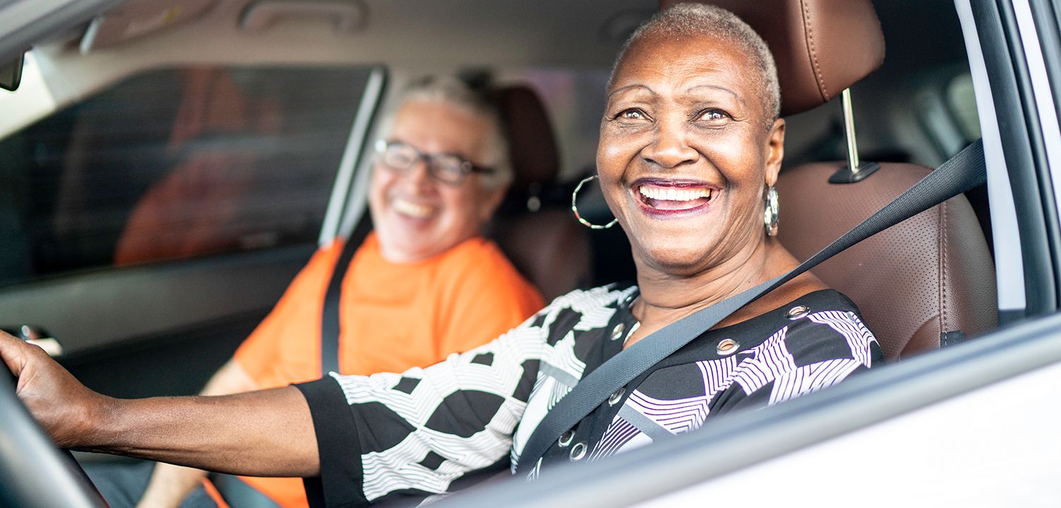Motorista mulher negra sorri dentro do carro. No carona, homem branco também sorridente