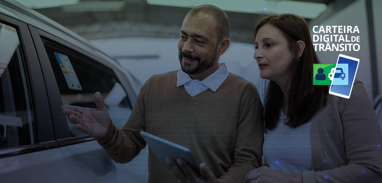 Vendedor segurando tablet mostra carro para compradora e no canto superior direito o ícone da carteira digital de transito - cdt