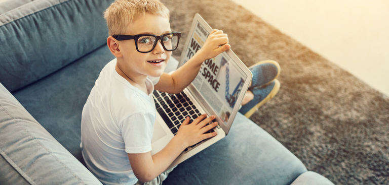 Uma criança sozinha, sentada no sofá e com um laptop no colo, olha pra trás e sorri