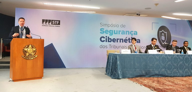 Tiago Iahn palestra no púlpito em Simpósio de Segurança Cibernética dos tribunais superiores, ao seu lado, quatro participantes assistem sentado à mesa.jpg