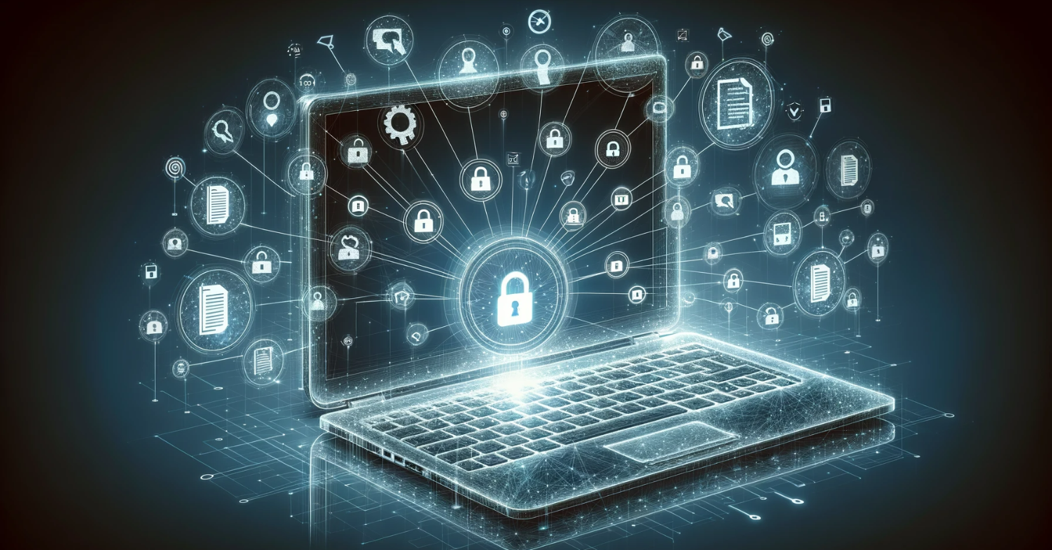 Símbolos que remetem a transparência e dados públicos flutuam sobre um laptop