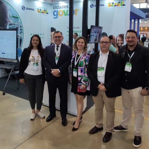 Diretor-presidente do Serpro, Alexandre Amorim, no estande do Serpro junto a membros das equipes técnica e de negócios da empresa