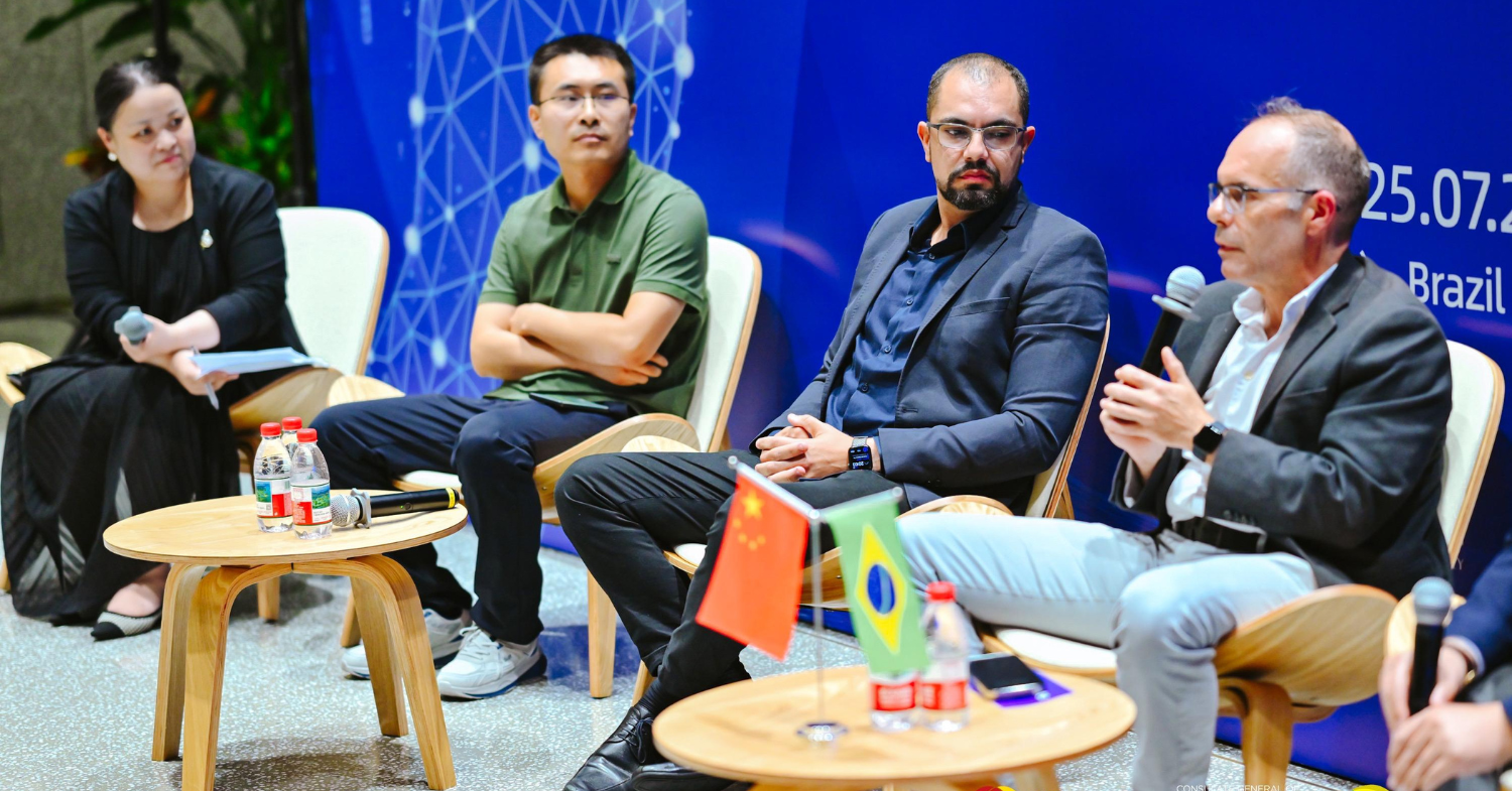 André Agatte, diretor de Negócios, Governo e Mercados do Serpro, e Rafael Ferreira, gerente de Internacionalização do Serpro, durante mesa-redonda com representantes da TI municipal de Xangai, do coletivo de mulheres em tecnologia, e da iFlytek, empresa líder em inteligência artificial na China
