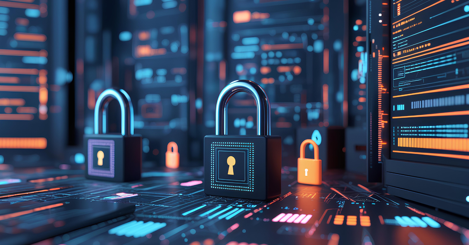 Imagem que evoca a cibersegurança, numa ambientação que remete a placas de circuitos e ilustrações de cadeados para representar recursos de proteção de dados