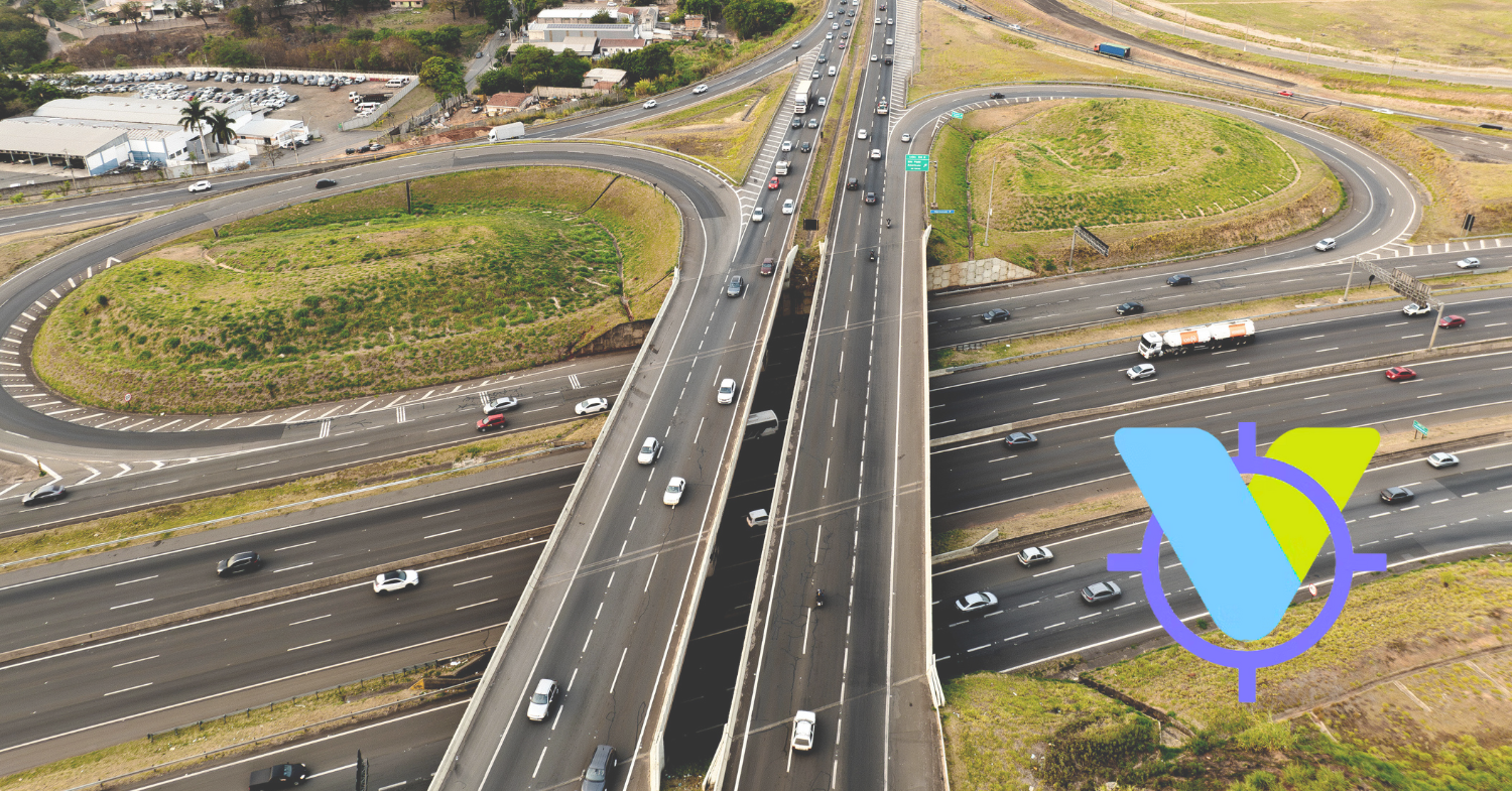 Marca do Serpro Visão aplicada sobre fotografia aérea que mostra a Rodovia Dom Pedro em Campinas (SP)