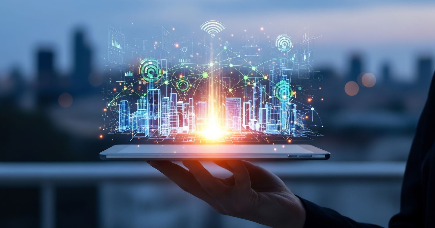 Mão segura um notebook aberto, projetando uma cidade digital iluminada com ícones de conectividade e gráficos, simbolizando tecnologia e transformação digital.