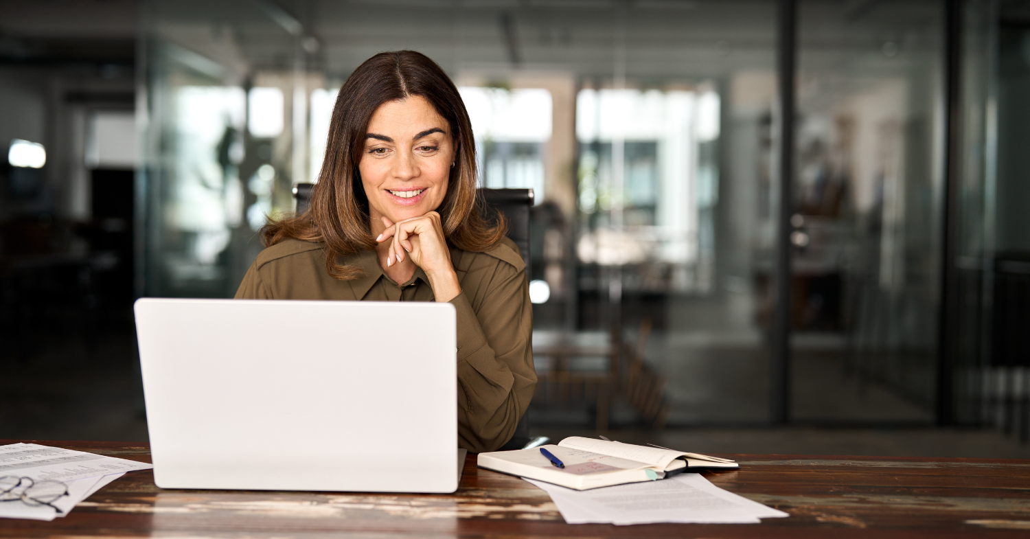 Fotografia de uma mulher trabalhando em um computador e sorrindo