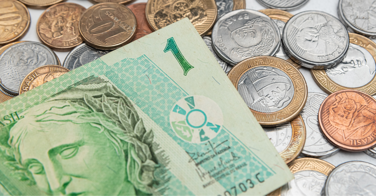 Fotografia de uma nota de um real sobre moedas de valores variados