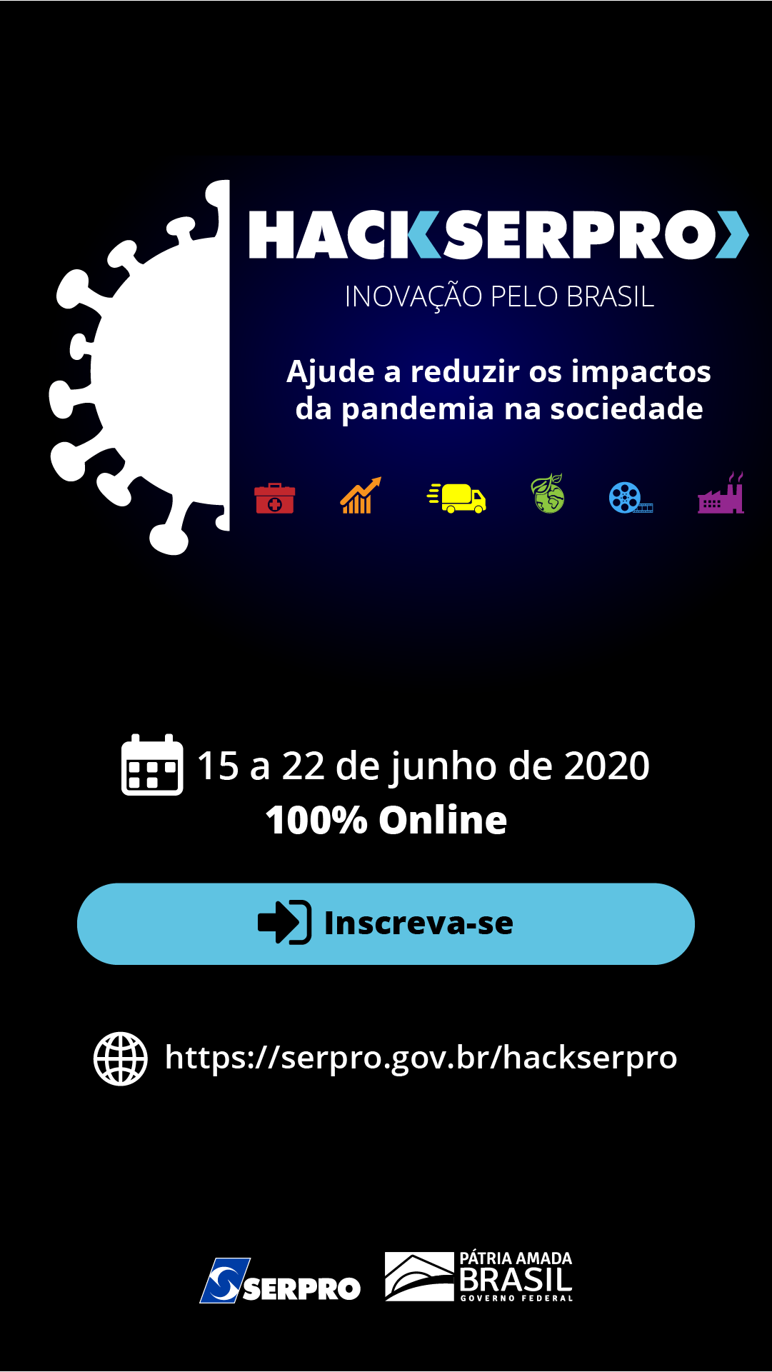 O Hackathon Serpro é um desafio pra quem tem sede de tecnologia. As equipes participantes deverão criar soluções que ajudem na redução dos impactos causados pelo novo coronavírus, contribuindo para uma rápida adaptação da sociedade às transformações culturais impostas pela pandemia.